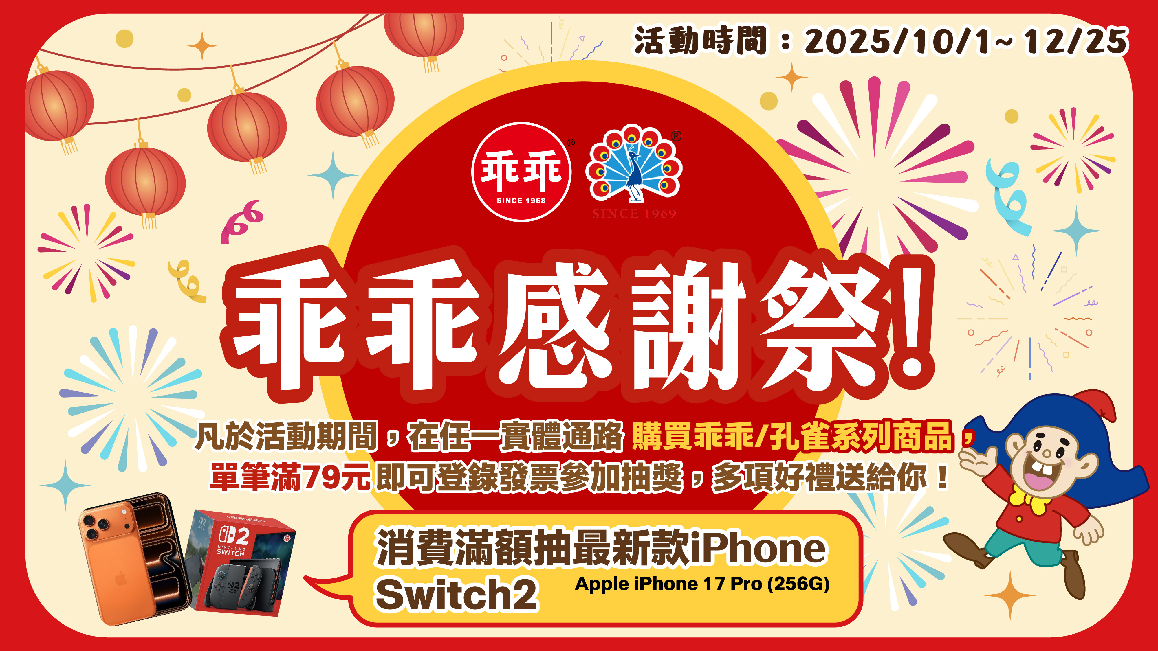:凡於活動期間,在任一通路購買乖乖/孔雀全系列商品,單筆滿79元即可登錄發票參加抽獎,多項好禮送給你!